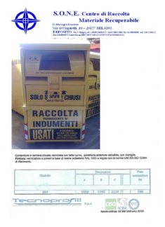 La nostra ditta è lieta di poter offrire il servizio della raccolta differenziata su tutto il territorio del comune, con i suoi cassonetti metallici di colore giallo (o altri colori) di dimensioni, cm. 115 x 115 x 212 H, per la raccolta d’indumenti smessi, scarpe, borse e cinture.